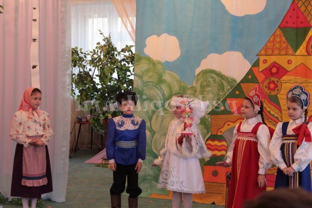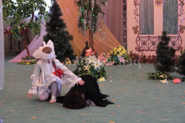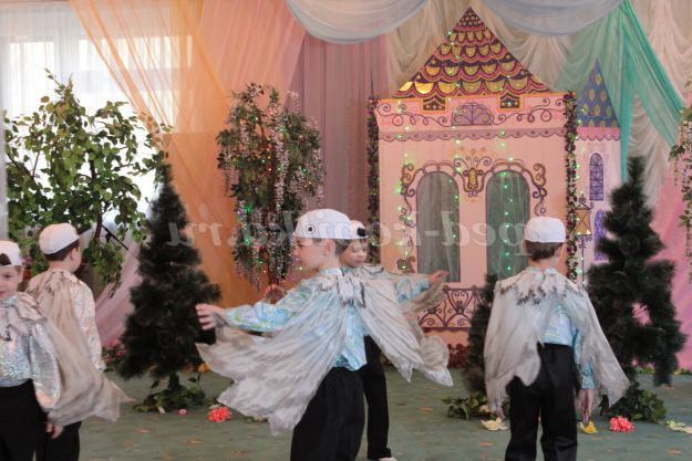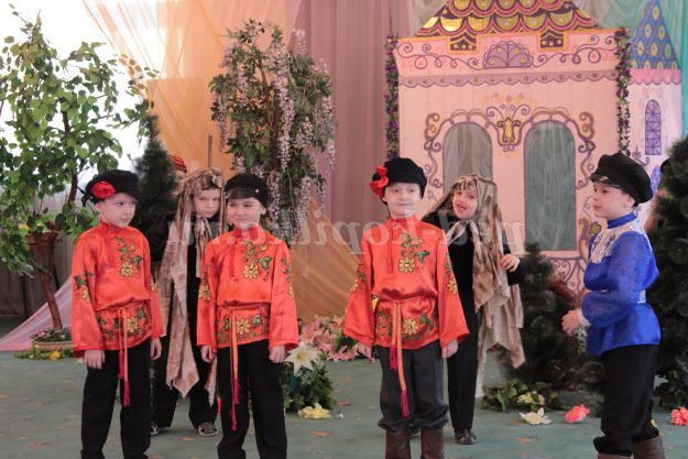 Торік мої випускники теж пробували себе в ролі акторів. Так як група була велика - 25 дітей, з яких тільки 8 дівчаток. Ми зупинилися на казці "Аленький цветочек". Розподілили ролі, стали вчити слова, підбирати міміку, жести, рухи. Основне навантаження при підготовці вистави взяла на себе керівник театральної студії, а ми вихователі - були її активними помічниками.