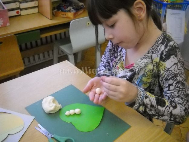 Вихователь: Молодці. Я теж думаю, що гусеницю потрібно зробити з кульок різного діаметру, тоді вона вийде симпатичніше. Не забудьте, що кожен раз вам потрібно буде брати тіста трохи менше. А перед тим як ви будете ліпити, вам потрібно вирізати листочок з картону, щоб було куди поміщати саму гусеницю.