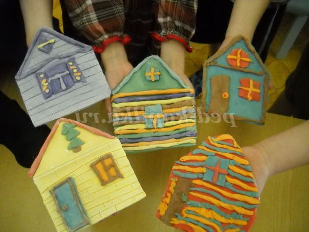 Після того, як діти закінчать ліплення, влаштовується виставка робіт. Розглядаємо отримані будиночки, відзначаємо найбільш вдалі, пропоную після просушування зробити виставку для батьків.