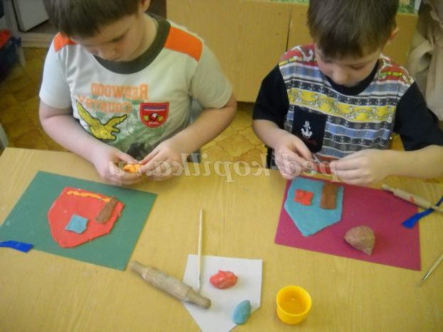 Вихователь: Сьогодні я пропоную вам самим придумати і зробити хатинку, але тільки не з пряникового, а з солоного тіста. Подивіться, яке кольорове тісто я вам сьогодні приготувала.