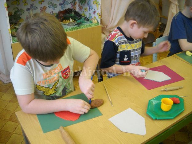 Вихователь: Спочатку вам потрібно буде розкачати тісто качалкою і вирізати стеком шаблон по контуру, який лежить у вас на столі. Потім, коли ваш будиночок буде готовий, я пропоную вам прикрасити його так, кому як заманеться, кольору можна брати будь-які, тільки пам'ятайте які кольори поєднуються один з одним.