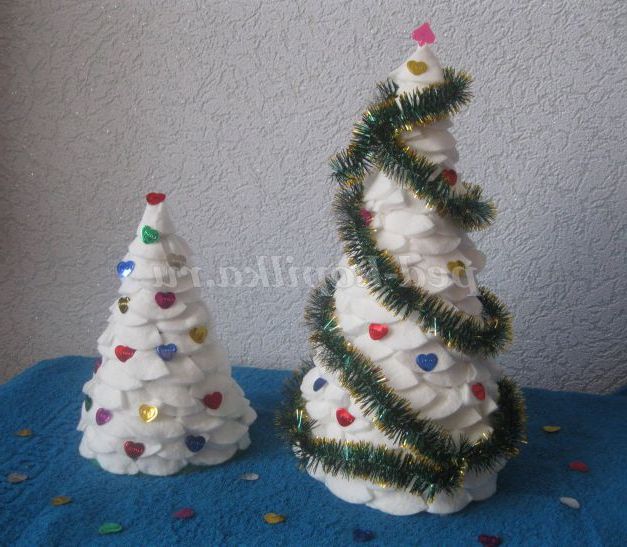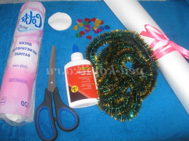 Хочете, я навчу вас теж? Приготуйте клей ПВА, косметичні ватні диски, лист ватману або картону, розмір, виберіть самі, він буде залежати від того, яку ялинку ви хочете отримати, будь-які прикраси (мішура, паєтки, бісер,...). Ще знадобляться ножиці і клееночка, щоб не забруднити стіл. Пам'ятайте: користуватися ножицями треба акуратно, щоб не поранитися. Отже, приступаємо!