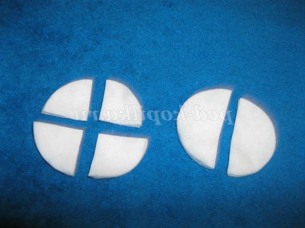 Зараз приготуємо для нашої ялинки гілки, вони білі - в інеї. Для цього ватні диски потрібно розрізати на 4 рівні частини.