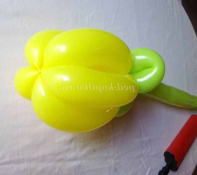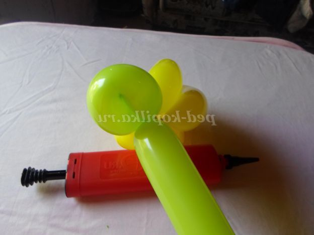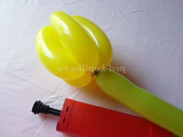 Приступаємо до виготовлення тюльпанів. Накачуємо насосом 1 жовтий і 1 зелений кулі, залишаючи при цьому не надутими хвостики шириною в долоню.