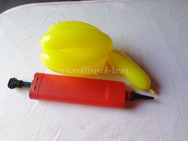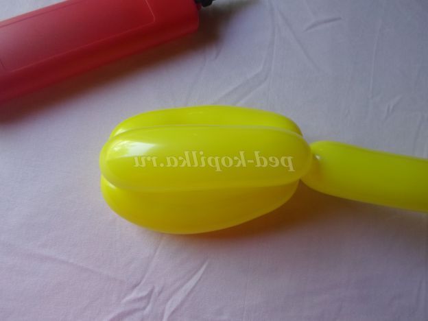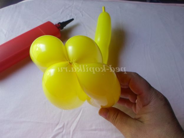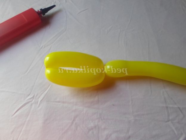 Жовтий куля візуально ділимо на 5 частин і скручуємо 2 міхура довжиною в долоню, закріплюємо їх у петельку.