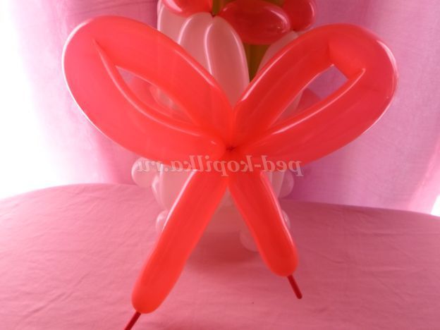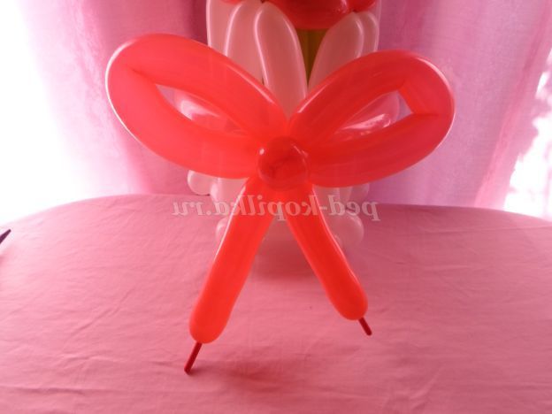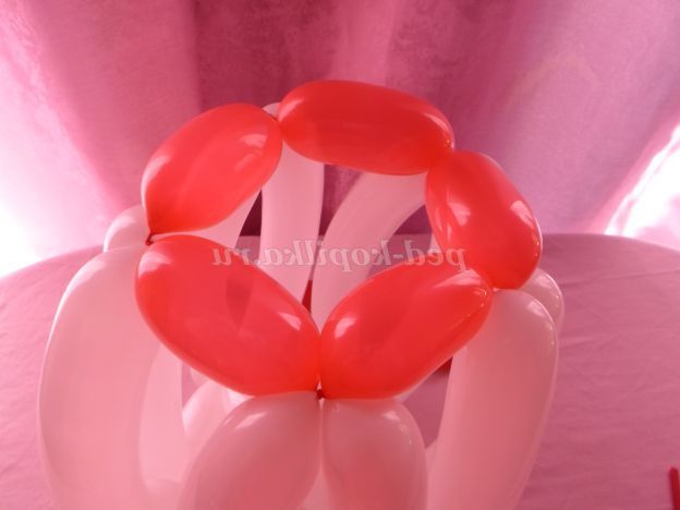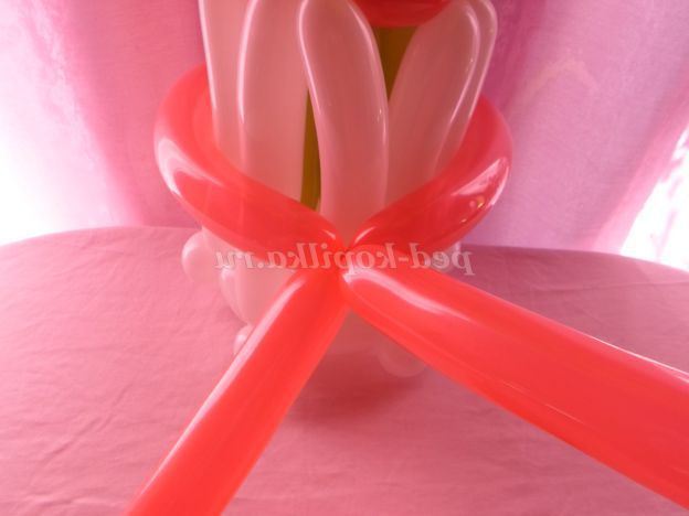 До середини одного пелюстки прив'язуємо червоний куля, відступаємо 7-8 см і закріплюємо ,перекручуючи, на середині другого пелюстки.