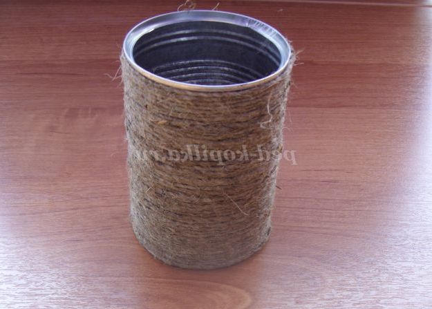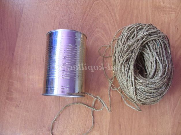 16.17.Далее робимо вазу. Беремо пакувальну мотузку, один кінець прикріплюємо скотчем до основи банки. І починаємо щільно намотувати мотузку на банку.