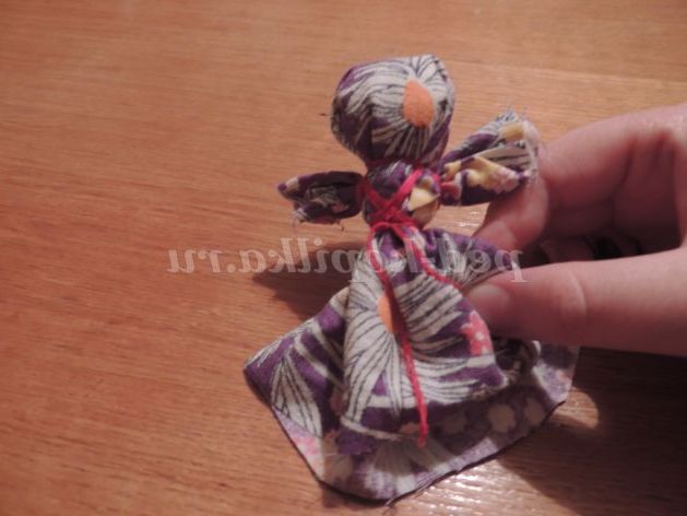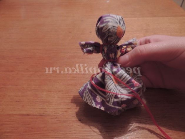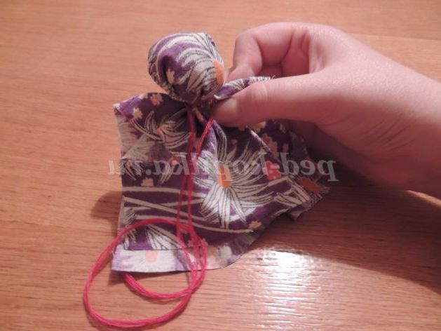 Потім формуємо ручки і тієї ж перев'язуємо ниткою під ними пояс лялечки.