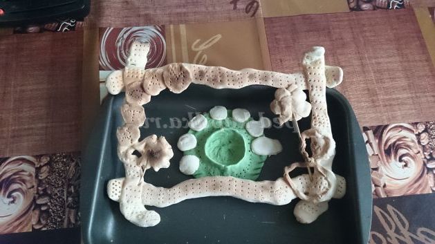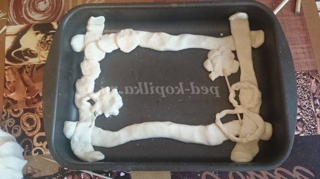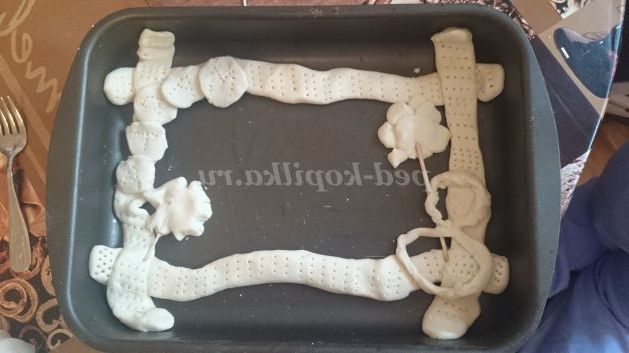 4. Після того як ми виліпили всі деталі і скріпили їх, викладаємо на деко виріб і продовжуємо декорувати. З допомогою виделки наносимо візерунки на рамку.