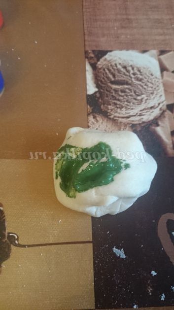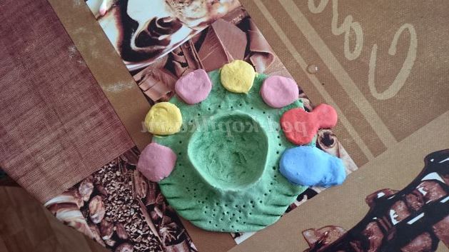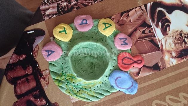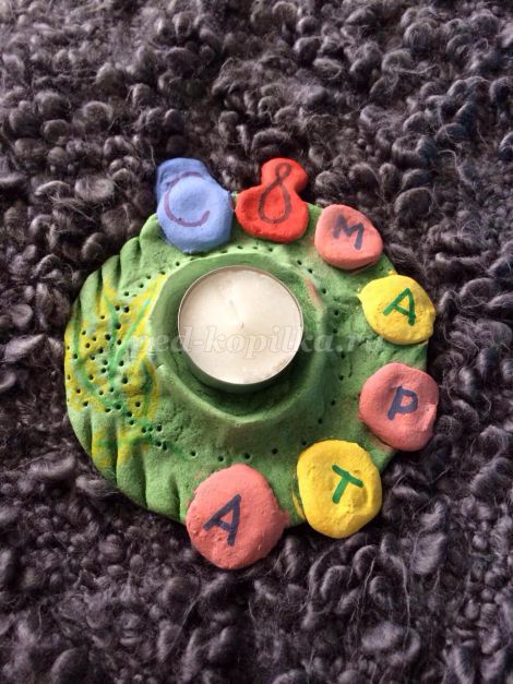 У нас залишилося трохи тесту, і ми вирішили зробити свічник для хресної. Щоб скоротити час роботи, вирішили відразу замісити кольорове тісто. Для цього в процесі замішування додали гуаш відразу в тісто. Розкатали коло, пляшкою видавили місце для свічки, запекли, розфарбували підписали і подарували)))