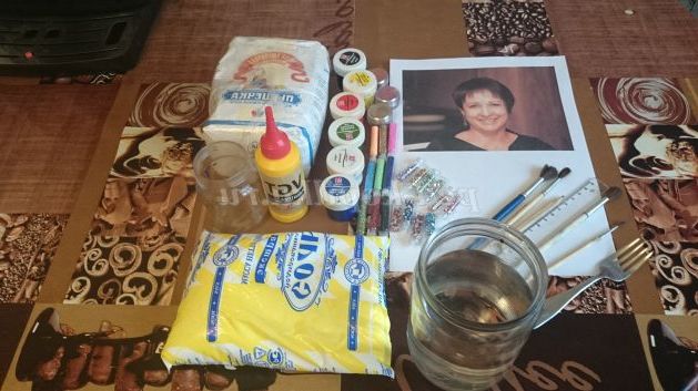 Матеріали:Борошно, сіль, вода(холодна), клей ПВА, скотч, мірний стаканчик, гуаш, пензлики, олівці, фломастери, ножиці, вилка, формочки для пластиліну, зубочистки/шпажки (обов'язково дерев'яні), роздруковане фото бабусі. Додатково можна використовувати блискітки, стрази та інше - для декору.