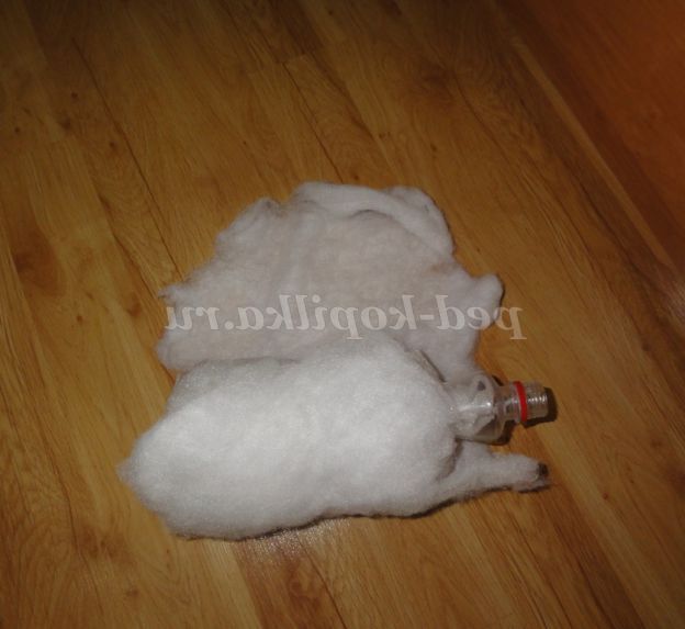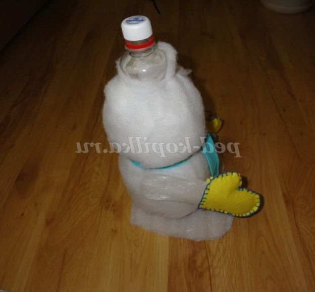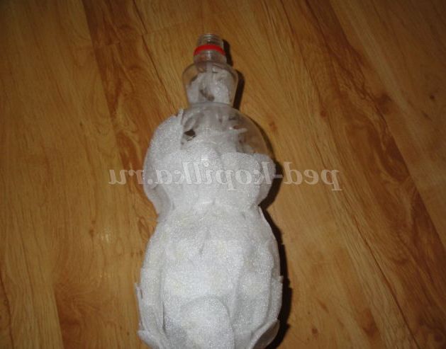 2.Посмотрите і за допомогою «лусочок» надайте пляшці задуманий обсяг. А тепер беремо синтепон, розмір якого відповідає пляшці і загортаємо в нього пляшку. Закріплюємо синтепон за допомогою нитки та голки ( пришиваємо місцями),і у нашого сніговика буде справжнє снігове вбрання