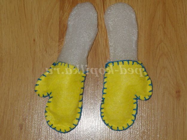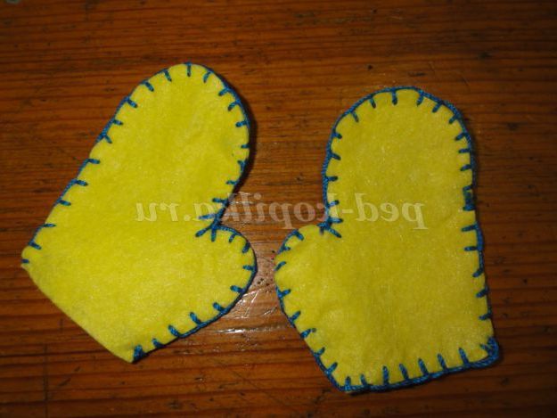 З віскозної серветки крім рукавиці,зшиваємо рукавиці за допомогою декоративного шва і одягаємо рукавички на ручки сніговика