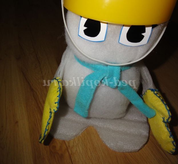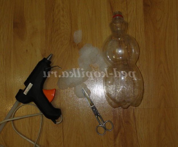 пластикова пляшка, синтепон, підкладка для ламінату, серветки віскозні,оракал, олівець, ножиці, клейовий пістолет, степлер, голки, нитки, кольорова стрічка і гарний настрій.