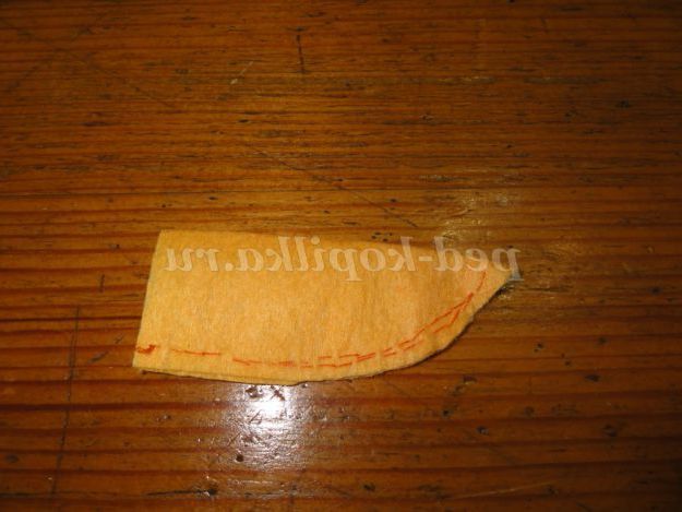 8.Из помаранчевої віскозної серветки крім ніс - морквину, зшиваємо, наповнюємо синтепоном і за допомогою клейового пістолета кріпимо