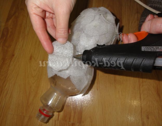 і за допомогою клею пістолета починаємо кріпити знизу вгору, як лусочки шматочки підкладки на пляшку.