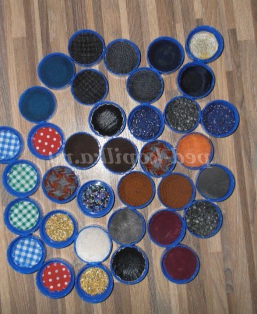Заповнити кришки цими матеріалами, вирізавши і приклеївши їх усередині кришок...