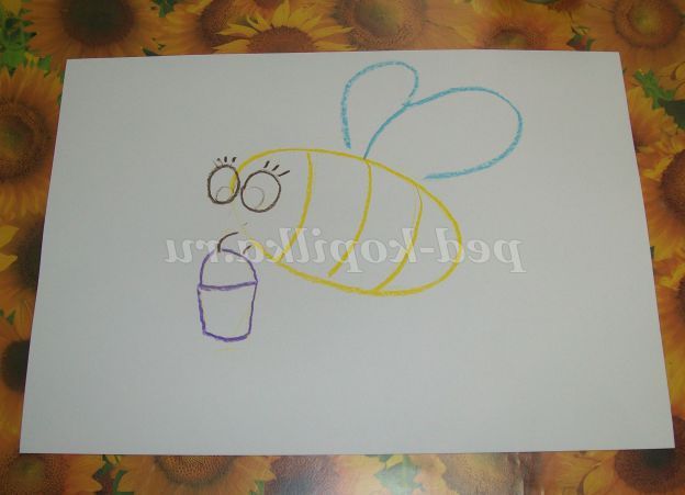 Беремо крейда і починаємо малювати бджілку. Я беру бджілку простої форми без зайвих деталей, на основі кола і овалу. Це дозволяє дітям малювати відразу крейдою, не використовуючи олівець та гумку, що в цій техніці не бажано.