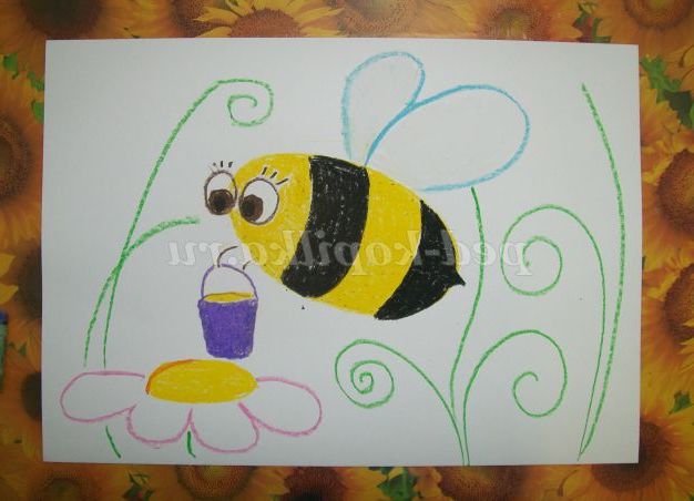 Коли бджілку закінчили, домальовували травичку і квіточки. Малюючи травичку, ми спочатку проводимо тонкі лінії, а потім повертаємося і робимо деякі травинки більш товстими (це створює ілюзію простору в малюнку). Головне добре тиснути на малий і зафарбовувати без пробілів, тоді картинка вийде ще яскравіше.