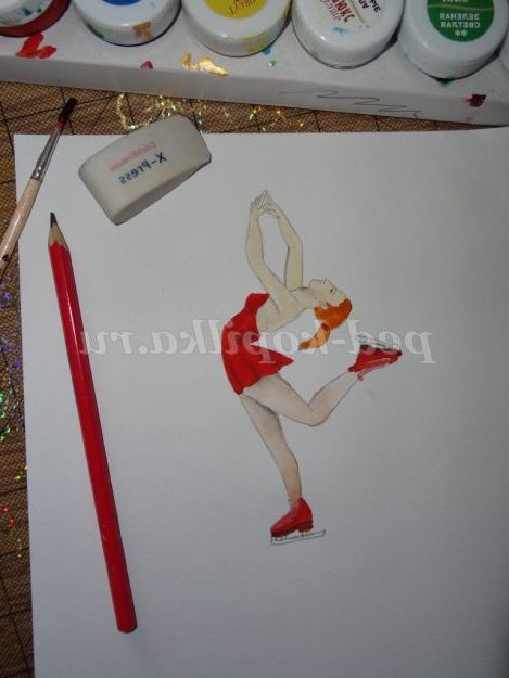 1. На білому картоні або білому цупкому папері намалювати гуашшю (фарбами) фігуру фігуристки.