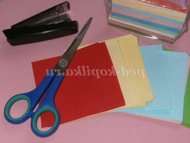 для роботи знадобиться папір, степлер, ножиці. Можна використовувати замість степлера клей, але тоді процес займе більше часу.