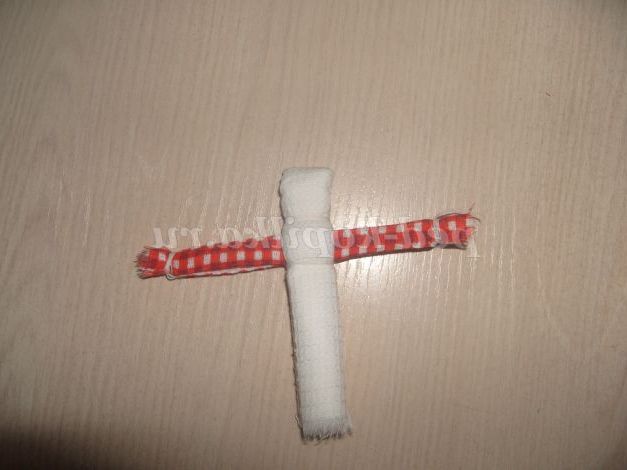 • 1 етап: клапоть білої тканини скручуємо до середини і перегинаємо навпіл, відступаємо приблизно 2 см від місця згину і перетягуємо кількома витками нитки за напрямом сонця(зі сходу на захід) (фото2)