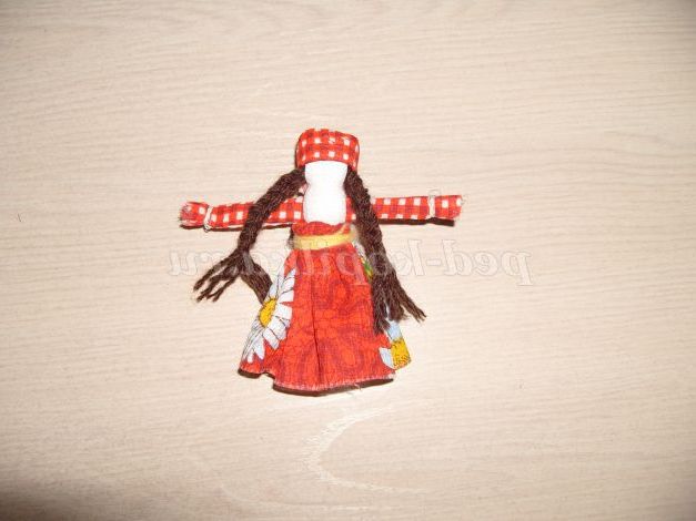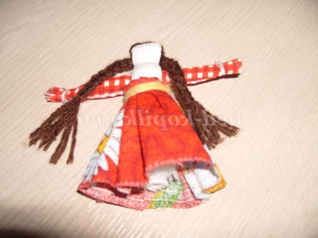 • Для формування спідниці нам необхідний клапоть кольорової тканини, складаємо його навпіл і збираємо спідничку. Обертаємо спідницю навколо талії ляльки і фіксуємо її ниткою на 2-3 вузлика. Розправляємо складочки на спідниці. (фото5)