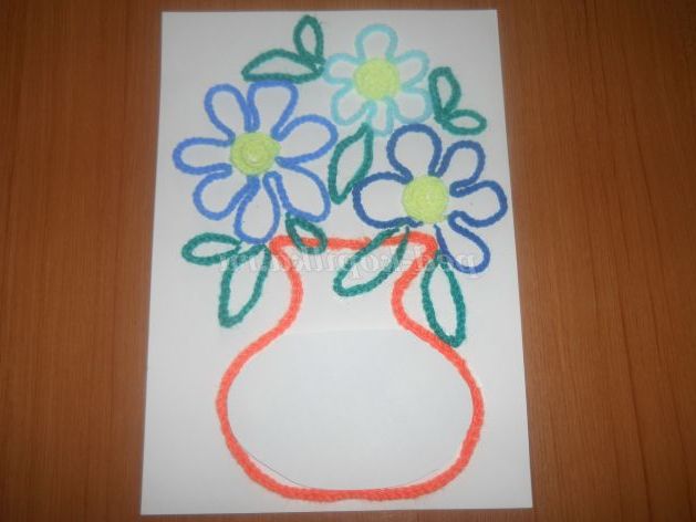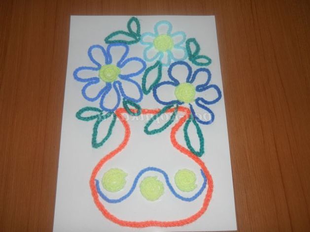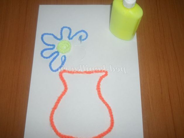 Клеєм вимальовує контур пелюсток. Ланцюжок синьою ниткою накладаємо на клей щоб вийшов квітка.