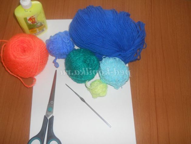 Клеєм намалювати хвилю і накласти на клей ланцюжок блакитною ниткою. Зробити кружечки так само як виготовляли серцевини для квітки.