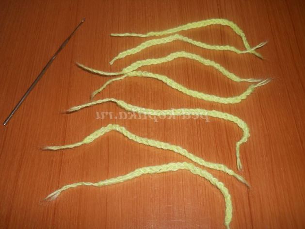 1. Для серцевини квітки в'яжемо гачком ланцюжок з 25 повітряних петель жовтою ниткою. Обрізаємо нитку.