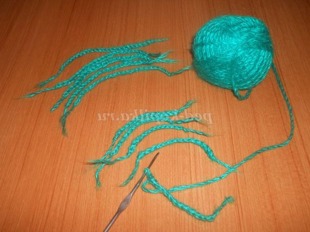 3. Для листочків зеленою ниткою зв'язати 5 ланцюжків і 25 повітряних петель і 5 ланцюжків з 15 повітряних петель.