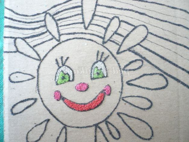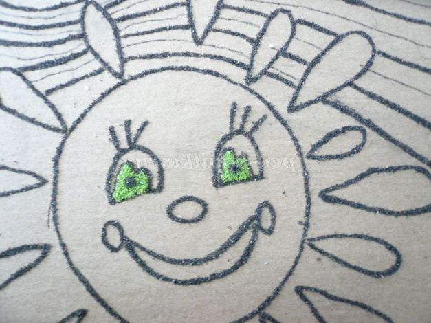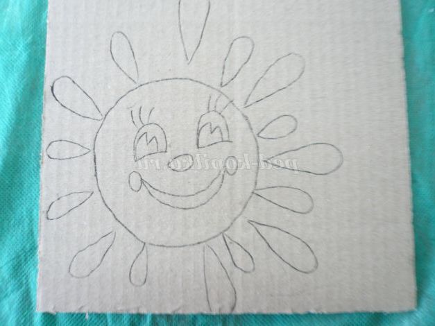 На картоні, малюємо сонечко, подрисовываем йому, кумедне личко, з очима і ротом.
