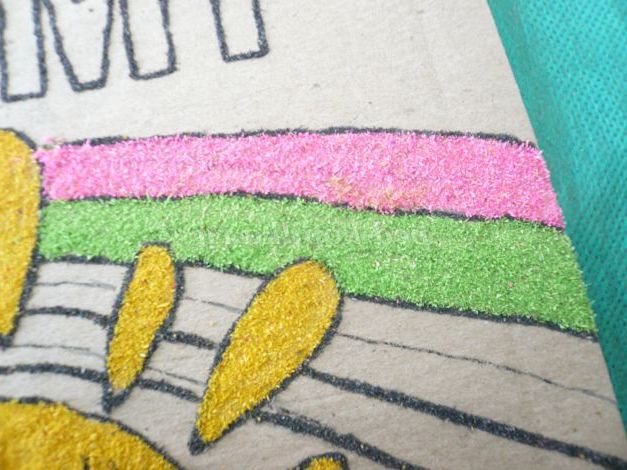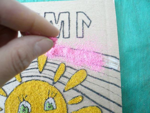 Розфарбовуємо веселку, для цього нам знадобляться, тирсу чотирьох кольорів. Акуратно, пензлем, по черзі наносимо клей і за секторами, засипаємо тирсою. У кожного сектора - свій колір: рожевий, зелений, помаранчевий, блакитний.