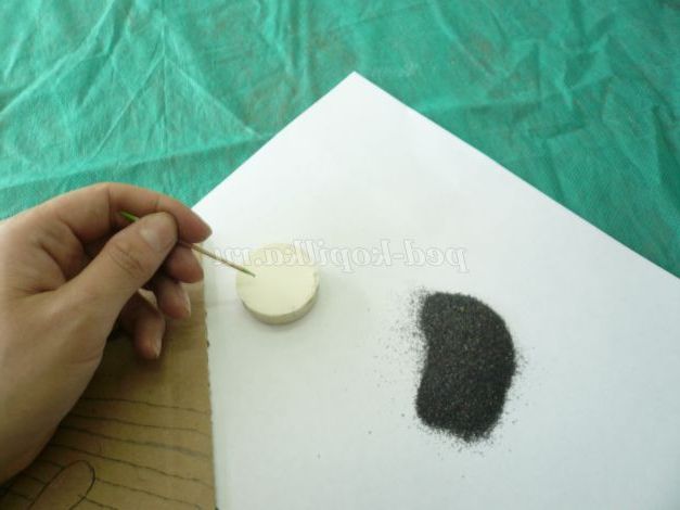 Приступаємо до розфарбовування, нашої роботи, кольоровими тирсою, для цього нам знадобиться кисть №2 і кольорові тирсу. Акуратно, пензликом, наносимо клей ПВА на очі і засипаємо їх зеленими тирсою.