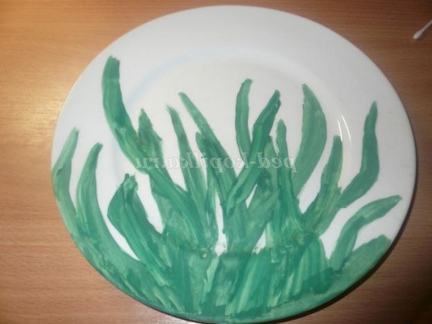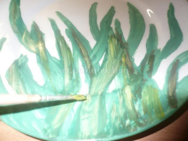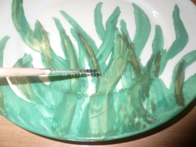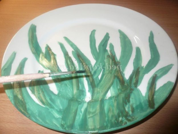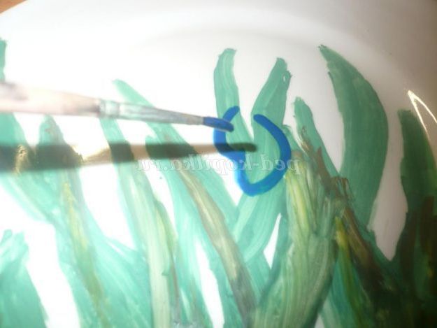Потім поверх зелених стебел наносимо трохи коричневого кольору, кисть змочуємо у невеликій кількості води, надлишки вологи витираємо сухою серветкою.