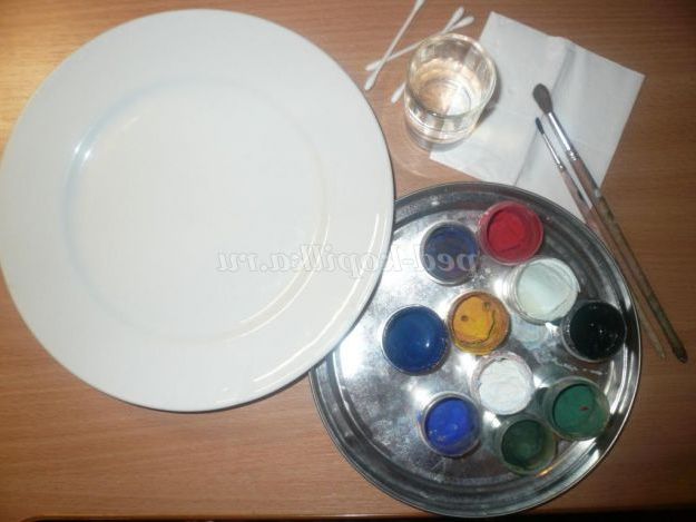 Плоска тарілка, гуаш, пензлі (білка № 1 і № 3), ватні палички, паперова серветка, вода.