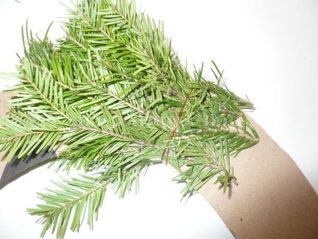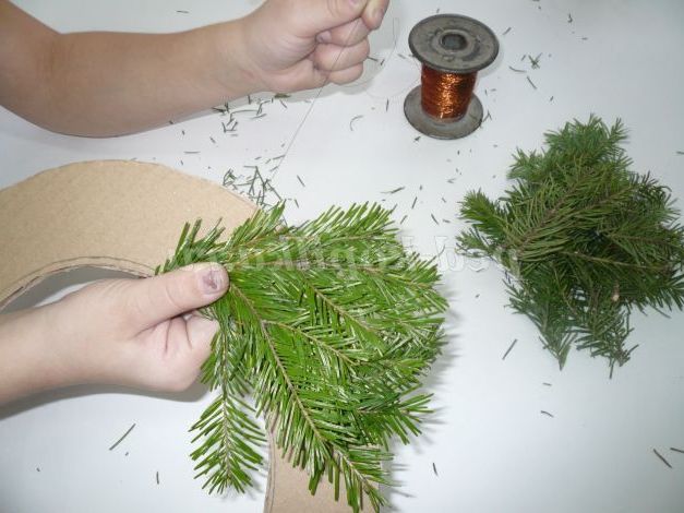Гілочки ялини (беремо невеликі, максимум 10 см в довжину) з допомогою дроту прив'язуємо до каркаса вінка.