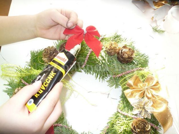 З допомогою клею «момент» приклеюємо до нашого вінка декоративні бантики.