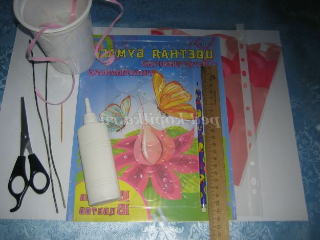 двостороння кольорова і біла папір; файл; лінійки (проста і з окружностями); ножиці; клей ПВА; простий олівець; зубочистка для скручування паперу, пластиковий стаканчик, тасьма, пакувальний пакет для квітів, дріт.