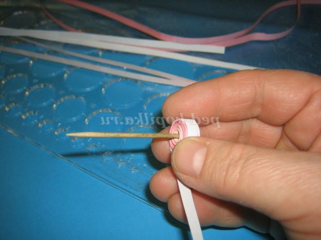 2. У тому ж порядку вставити кінчик смужки в проріз зубочистки і починати накручувати, роблячи кругові обертання. Витки смужок повинні щільно прилягати один до одного.