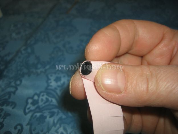 10. Чорну смужку щільно накручуємо на зубочистку і заклеюємо край. Далі намотуємо рожеву смугу і заклеюємо край.