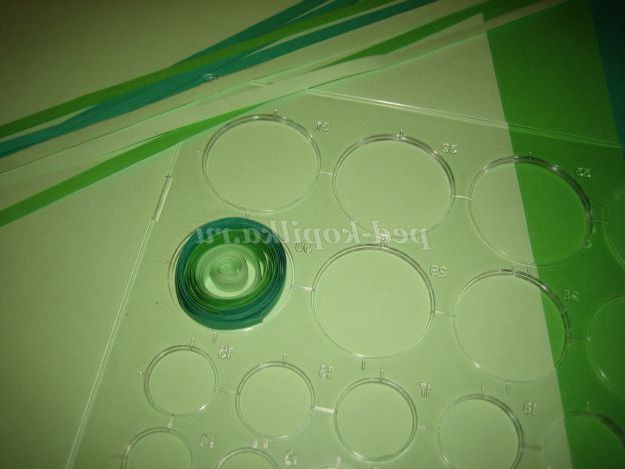 3. Дійшовши до кінця, помістити в окружність лінійки діаметром 21мм, зняти з зубочистки, дати спиральке розпуститися. Заклеїти край.