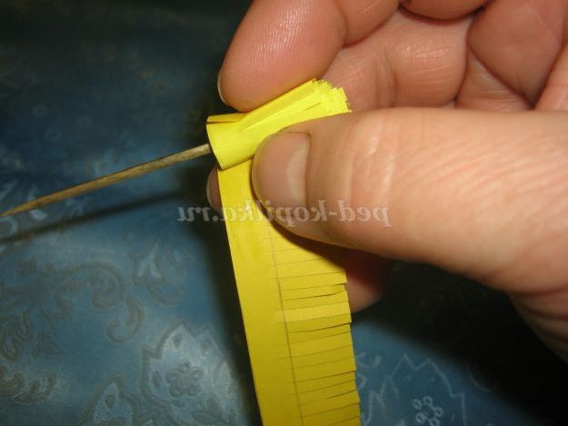 3. Вставити кінчик світло-жовтої смужки в проріз зубочистки і починати накручувати, роблячи кругові обертання. Витки смужок повинні щільно прилягати один до одного. В кінці закріпити клеєм.