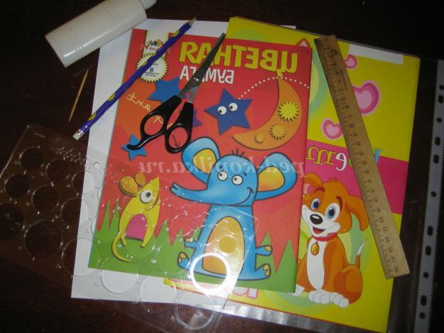 кольоровий картон; кольоровий двосторонній папір; білий аркуш формату А4; файл; лінійки (проста і з окружностями); ножиці; клей ПВА; простий олівець; зубочистка для скручування паперу.