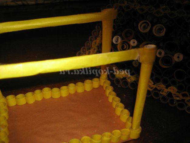 12. Розрізати навпіл жовті трубки і приклеїти їх по всіх кутках низу годівниці.