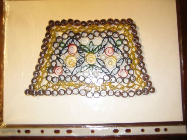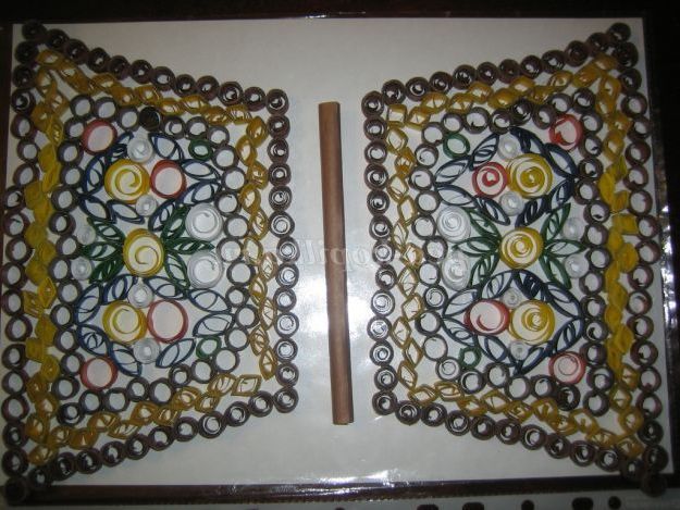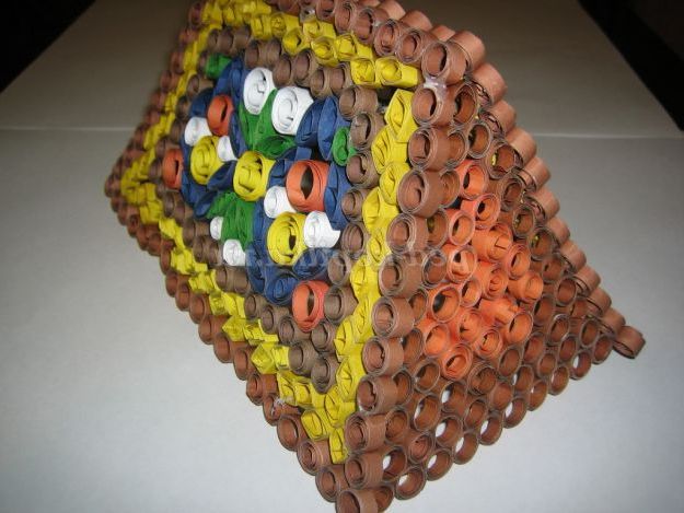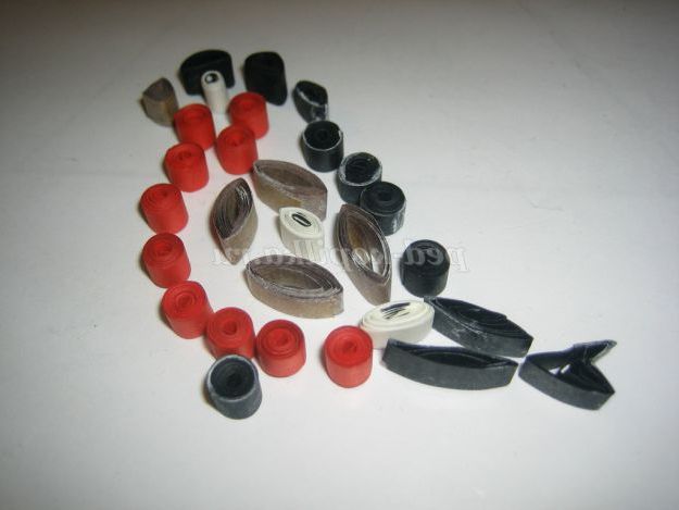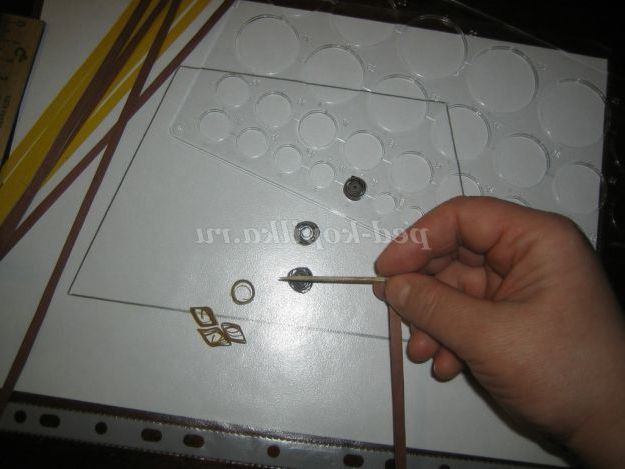 2. З паперу коричневого і жовтого кольору, нарізати смужки шириною 5 мм Вставити кінчик смужки в проріз зубочистки і починати накручувати, роблячи кругові обертання. Витки смужок повинні щільно прилягати один до одного. Дійшовши до кінця, помістити в окружність лінійки діаметром 10 мм, зняти з зубочистки, дати спиральке розпуститися. Кожен наступний рол (спіралька) буде такого ж розміру. З жовтих ролів зробити ромбики.