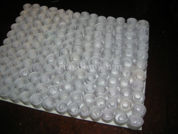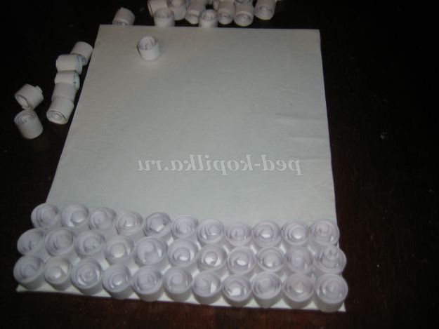 15. Робимо підставу для поробки. Із білого картону виріжте прямокутник (довжина 19см, ширина 15см). З білого паперу накрутити роли діаметром 10мм, наклеїти на картон і вийде сніг.