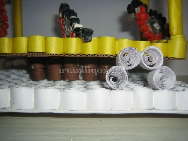 5. Далі викласти знову ряд коричневих ролів, склеїти їх між собою. Нарізати кольорові смужки шириною 5мм для подальшого прикраси даху.