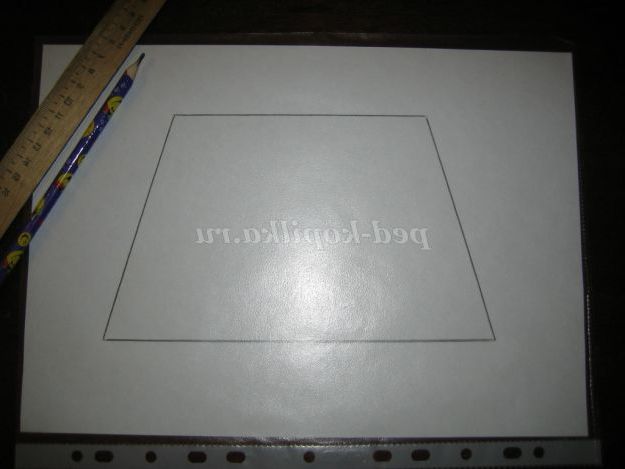 1. Почнемо роботу з даху годівниці. На білому аркуші А4 накреслити трапецію (довжина сторін: 14 і 21 см, висота 12 см)- це буде форма даху. Лист вкласти в файл, щоб потім деталі не приклеїлися до паперу.