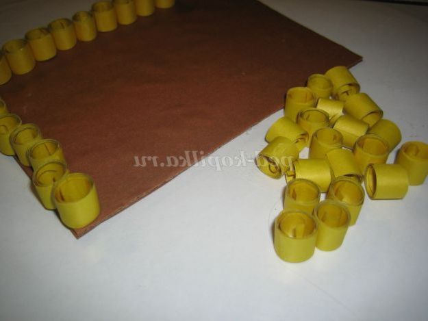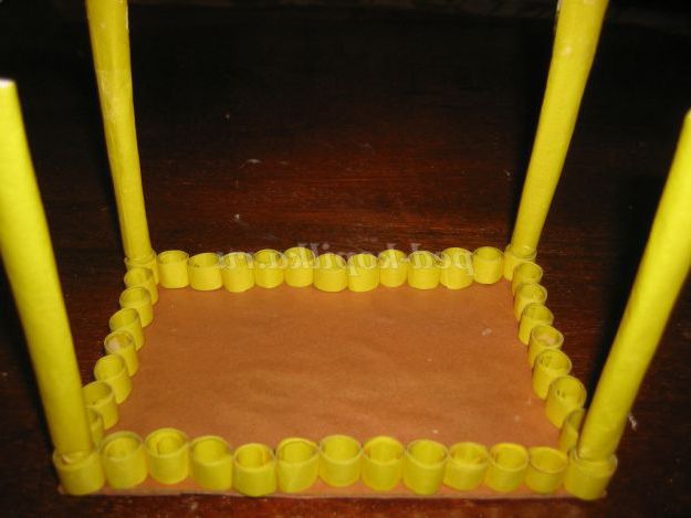 10. Для низу годівниці взяти картон коричневого кольору, вирізати прямокутник (довжина 15 см, ширина 10 см). Накрутити роли жовтого кольору діаметром 10 мм, з смужок шириною 10 мм. Наклеїти їх по сторонах прямокутника.